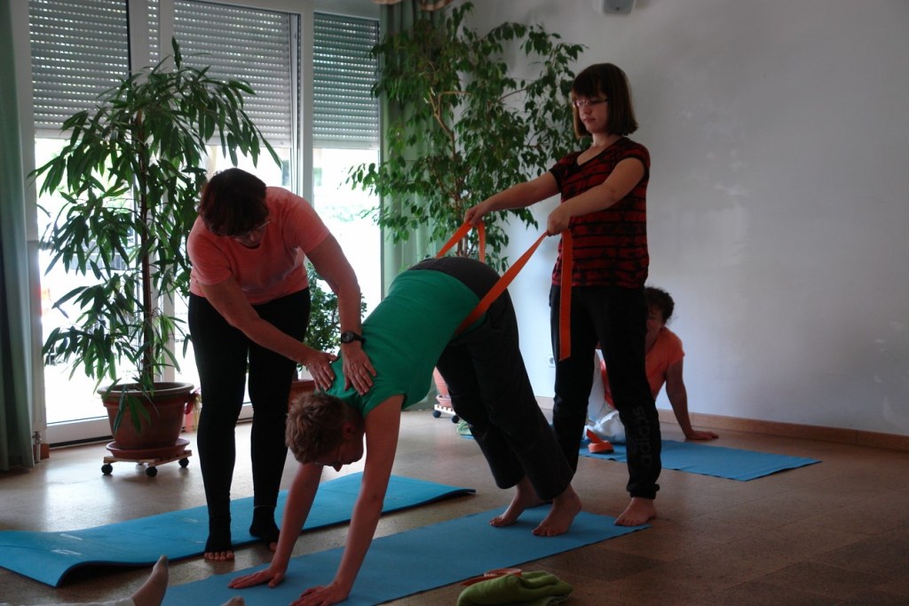 Unter der Leitung der zertifizierten Yogalehrerin Gisela und Elke erlernten die Interessierten, ihre Bewegungsmöglichkeiten im Oberkörper und in den Händen zu erweitern bzw. zu verbessern. Die Einschätzung der unterschiedlichen körperlichen Konstitutionen war zunächst notwendig, um die Übungen entsprechend differenziert durchführen zu können. Eine kleine theoretische Einführung in das Thema Yoga bildete den Startpunkt des Workshops, eine kurze Vorstellung der Grundlagen von Yoga wurde gegeben.